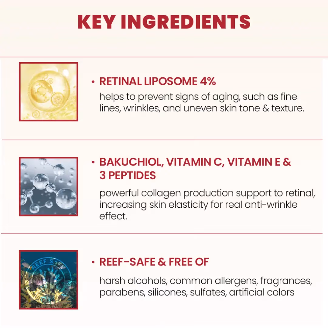 1. বয়সের ছাপ কমানো: Retinal (Vitamin A derivative) ত্বকে কোলাজেন তৈরিতে সাহায্য করে, ফলে বলিরেখা ও সূক্ষ্ম রেখা কমে।